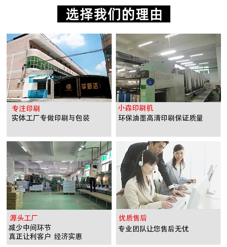 服務(wù)團(tuán)隊(duì):業(yè)務(wù)團(tuán)隊(duì)均由從事五年以紙品印刷經(jīng)驗(yàn)的專(zhuān)業(yè)人員擔(dān)任,采用1對(duì)1全程跟蹤貼心服務(wù)模式,并提供專(zhuān)業(yè)設(shè)計(jì)師配合。線(xiàn)下23年的大牌直供經(jīng)驗(yàn),各類(lèi)工藝成熟,從定制、印刷、設(shè)計(jì)、售后一條龍服務(wù),以合理的價(jià)格竭誠(chéng)為廣大客戶(hù)提供最優(yōu)質(zhì)的產(chǎn)品和服務(wù)。